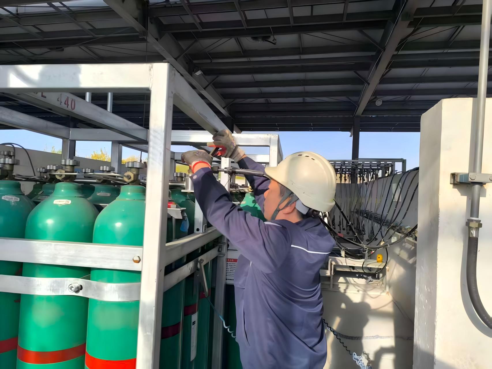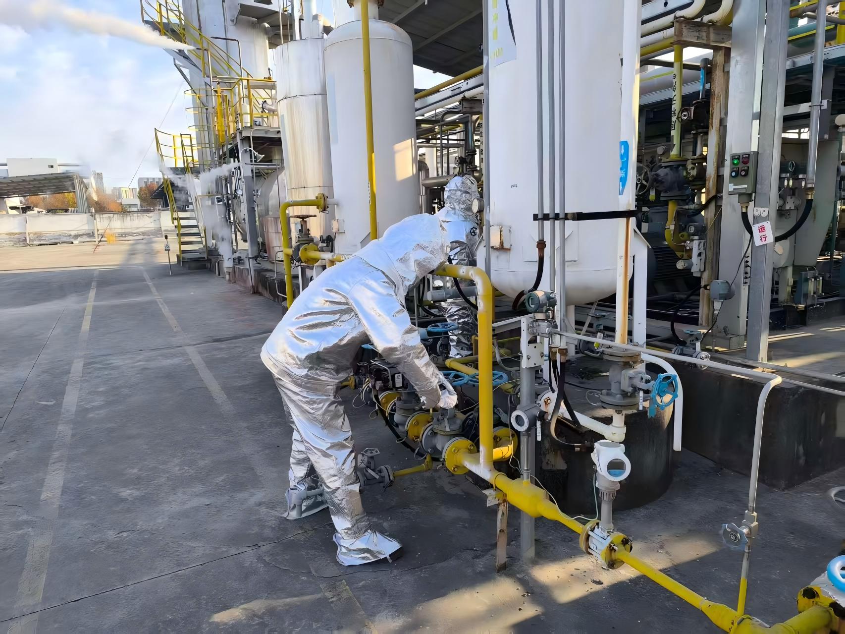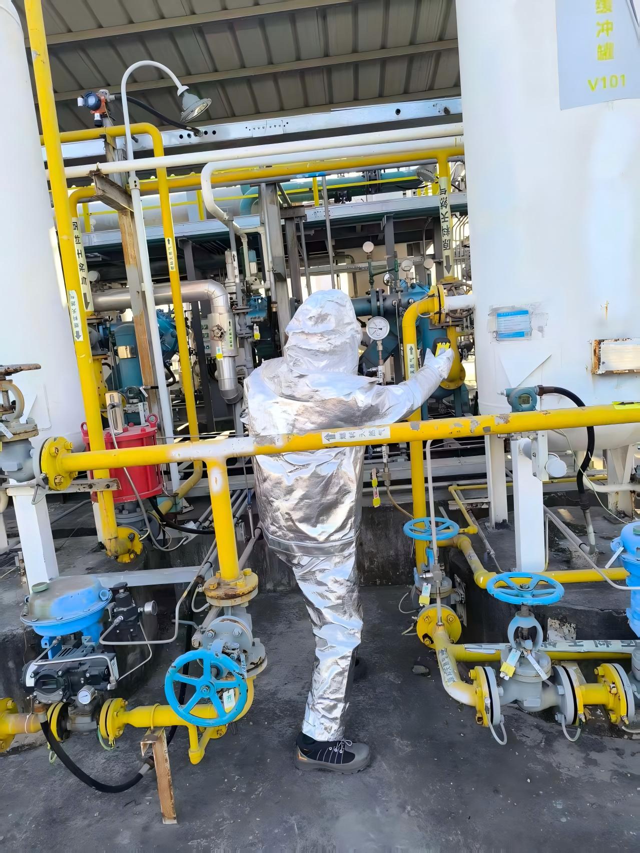 设备技术员孔朝辉更换原料气缓冲罐法兰垫片,并对泄露法兰重新紧固。检查泄漏缓冲罐过火情况、周边设备损坏程度,向制氢站站长李云建议:“受高温影响,原料气缓冲罐及周边的管道需进行压力试验,确认安全后,方可重新开机。”